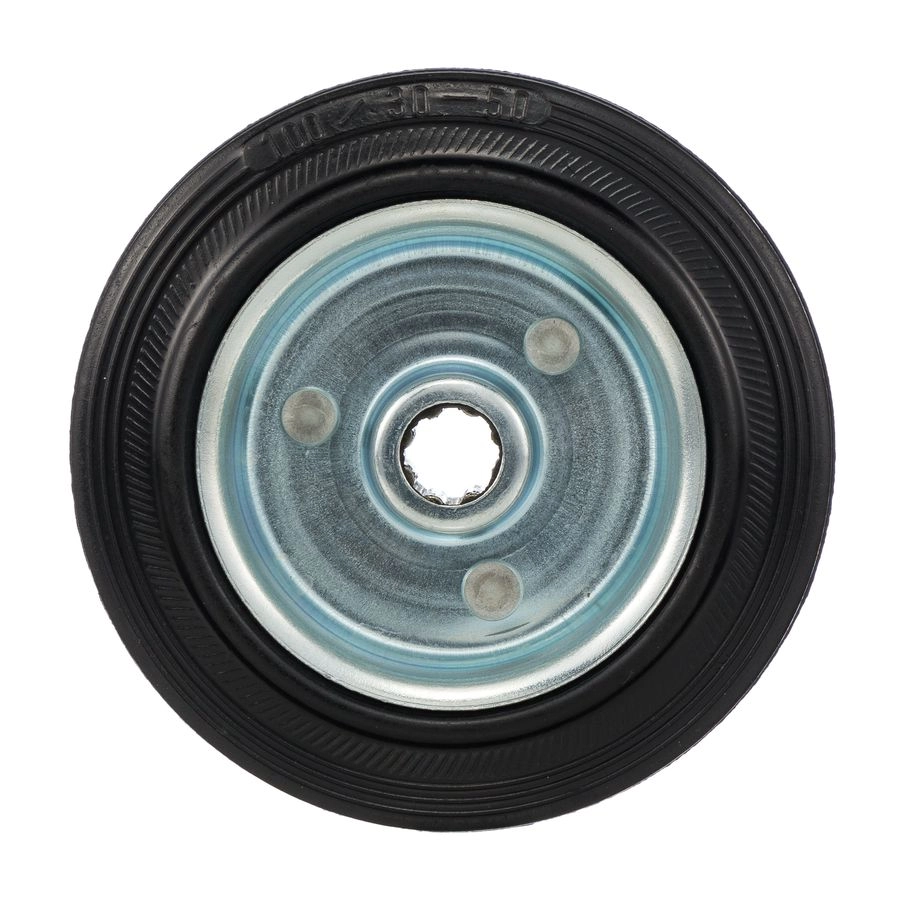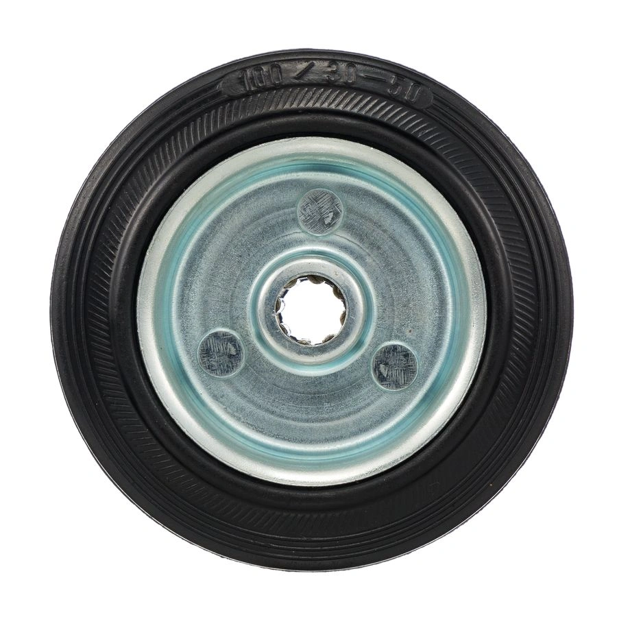 Колесо 4000-100 диаметром 100мм. под ось 12мм. Колесо из черной литой резины. Центр из стального оцинкованного обода из штампованной стали. В оси колес роликовый подшипник. Колеса из черной резины, центр из двух гальванизированных дисков из штампованной стали. Роликовый (игольчатый) подшипник расположен в углублении, выдавленном под прессом, и содержит цилиндрические ролики подшипника. Возможно применение на относительно грубых полах складов, заводов, производственных и строительных площадках. Данные колеса можно использовать на неровных поверхностях, во влажной окружающей среде и использовании вне помещения, не рекомендуется применять в среде с органическими растворителями, хлорированными веществами, гидрокарбонатами и минеральными маслами. Температура эксплуатации от -20 до +70С.