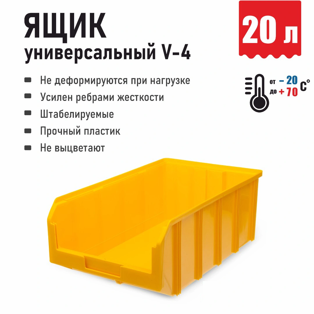 Пластиковый ящик Стелла-техник V-4 синий (502х305х184мм.), 20 литров, подходит для хранения мелких предметов, таких как: запчасти, детали, заготовки и т.п. Контейнер имеет удобную форму. Возможность наращивания передней стенки позволит наполнить ящик до верха и вместить гораздо большее количество деталей. Для быстрого и удобного поиска контейнера в складском помещении на передней стенке предусмотрен карман для размещения ярлыка с описанием. Изделие имеет удобные ручки для перемещения и специальные крепления для наращивания нескольких ящиков в высоту. Объем составляет 20 литров, корпус выполнен из пропилена Вес 1,2кг. Габариты 502x305x184мм. Технические характеристики ящика V-4: длина 502мм., ширина 305мм., высота 184мм. Объем 20л. Температура эксплуатации от -20 до +70С.