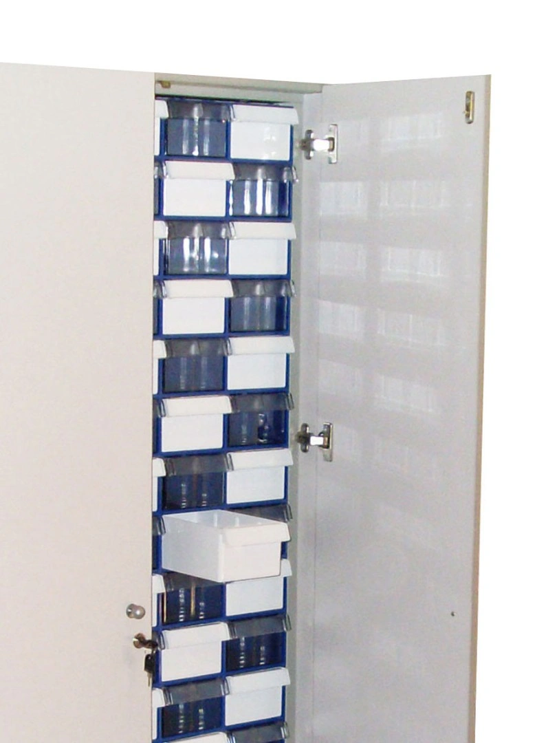 Шкаф в сборе Стелла-техник С-2-90-Д на 90 коробов (ЛДСП) отлично впишется в интерьер любого склада, подсобного или торгового и офисного помещения. Цвет ламинированного ДСП - серый. Цвет коробов С-2 синий, прозрачный. Главная особенность шкафа – объединение большого количества коробов с определенным типовым размером. Наличие дверей позволяет скрыть содержимое шкафа от посторонних глаз и ограничить несанкционированных доступ к содержимому. Регулируемые ножки шкафа гарантируют устойчивость шкафа даже на неровных полах. Изделие допускает одновременное применение 90 пластиковых складских контейнеров. Прозрачные внутренние короба С-2 позволяют легко находить содержимое и контролировать полноту наполнения. Внутренний короб легко вынимается для опустошения или наполнения, по принципу спичечного коробка. Он имеет рельефную структуру днища и усиленные толстые стенки. За счет этого изделие справляются с высокими эксплуатационными нагрузками. Внутренние полезные размеры выдвижного короба: 220х123х80мм. Возможность установки одной продольной перегородки (артикул: С-2 продольная) или до трех поперечных (артикул: С-2 поперечная). Продольная и поперечная перегородки одновременно не устанавливаются. Перегородки в комплект короба не входят и поставляются отдельно. Рекомендуемая нагрузка на короб, в составе шкафа, не более 3кг.